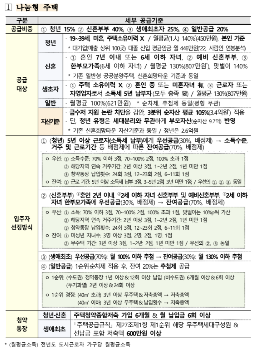 25만 호를 공급하는 나눔형 주택은 공급물량의 80%를 미혼 청년(15%), 신혼부부(40%), 생애최초자(25%)에게 특별 공급하고 나머지 20%는 일반공급(추첨제 20%)을 통해 공급합니다.