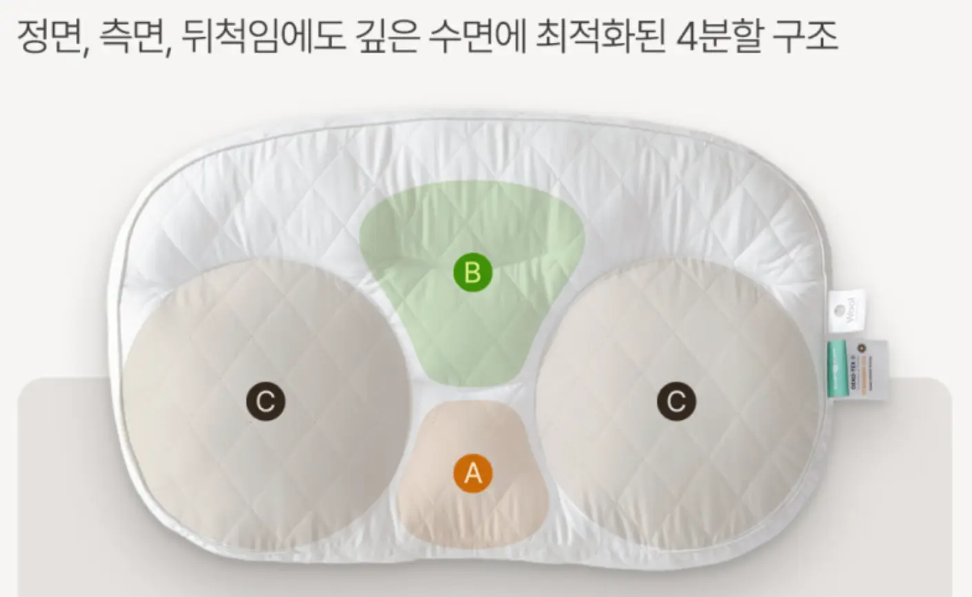 아이유 베개의 가장 큰 특징은 4분할 구조입니다. 중앙부(머리), 하단부(경추), 그리고 넓은 양 측면부로 나뉘어 있습니다. 이 구조는 정자세뿐만 아니라, 수면 중 뒤척이거나 옆으로 누웠을 때도 어깨를 편안하게 받쳐주도록 설계되었습니다. 자세를 바꿀 때 경계나 턱이 없어 뒤척임이 수월하다는 장점이 있습니다.