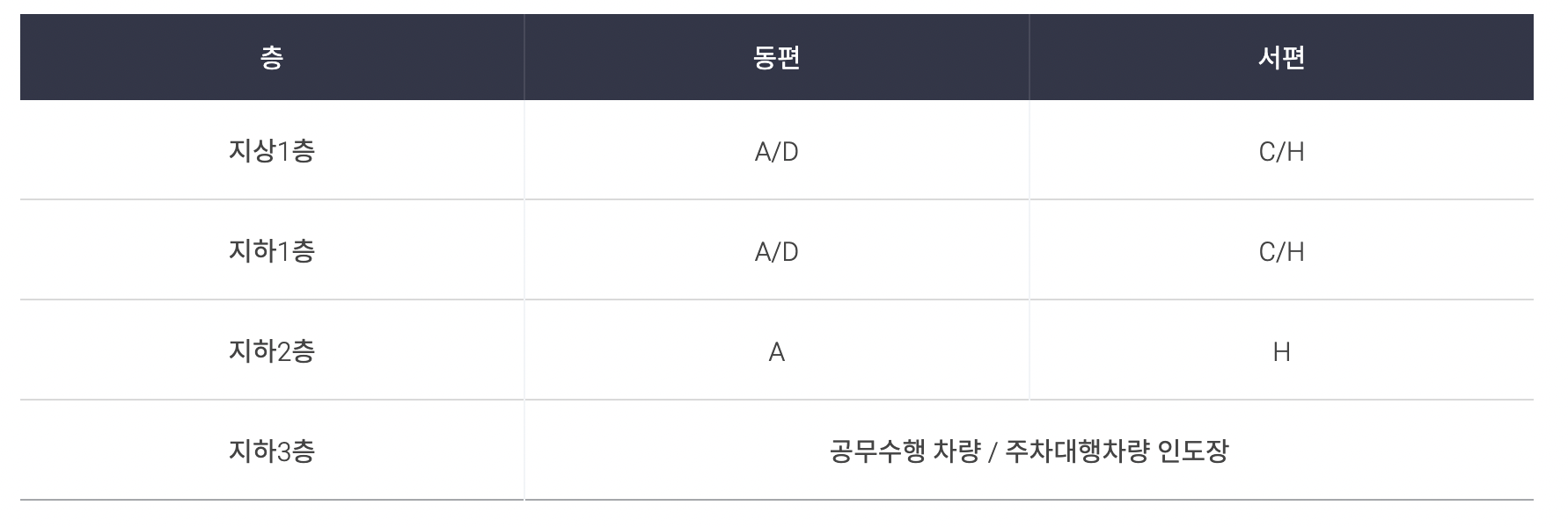 승용차, 버스, 택시 및 승용차 장기 주차장(주차타워 및 실외)으로 구분되어 있음