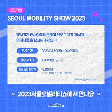 2023 서울 모빌리티쇼(서울 모터쇼) 입장권은 온라인 구매 및 전시 현장 오프라인 구매 방법 2가지가 있습니다. 사전예매 기간 동안 정상가 15,000원에서 20% 할인된 12,000원에 티켓 구매가 가능했으나 현재는 정상가로만 온라인 구입하실 수 있습니다. 단, 전시장 현장에서는 일반 할인 대상자에 한해 12,000원에 티켓 구매가 가능하니 일반할인 대상이신 분은 온라인보다는 현장에서 오프라인으로 구매하시는 걸 추천드립니다.