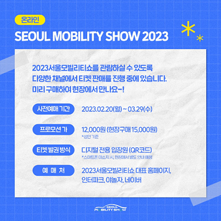 2023 서울 모빌리티쇼(서울 모터쇼) 입장권은 온라인 구매 및 전시 현장 오프라인 구매 방법 2가지가 있습니다. 사전예매 기간 동안 정상가 15,000원에서 20% 할인된 12,000원에 티켓 구매가 가능했으나 현재는 정상가로만 온라인 구입하실 수 있습니다. 단, 전시장 현장에서는 일반 할인 대상자에 한해 12,000원에 티켓 구매가 가능하니 일반할인 대상이신 분은 온라인보다는 현장에서 오프라인으로 구매하시는 걸 추천드립니다.
