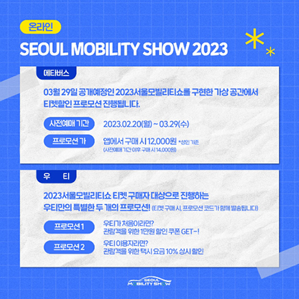 입장권 외에도 메타버스로 즐기는 2023 서울 모빌리티쇼(서울 모터쇼) 티켓도 서울모빌리티쇼 메타버스 앱을 설치하여 어플을 통해 입장권을 구매하실 수 있는 점 참고하시면 좋을 것 같아요. (안드로이드, 아이폰)